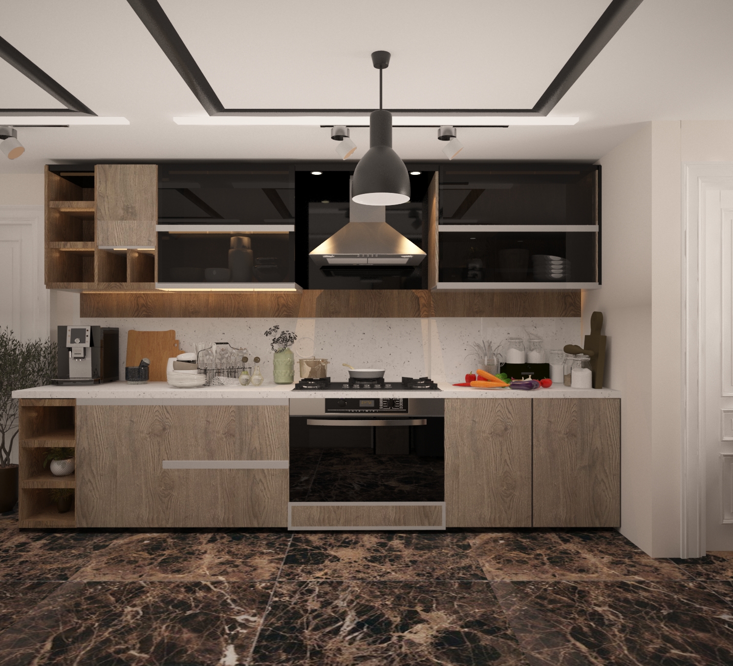 - الإضاءة: استخدام إضاءة LED أو مصابيح مدمجة يمكن أن يبرز تفاصيل التصميم ويعزز من جمالية المطبخ، خاصة في المساء.